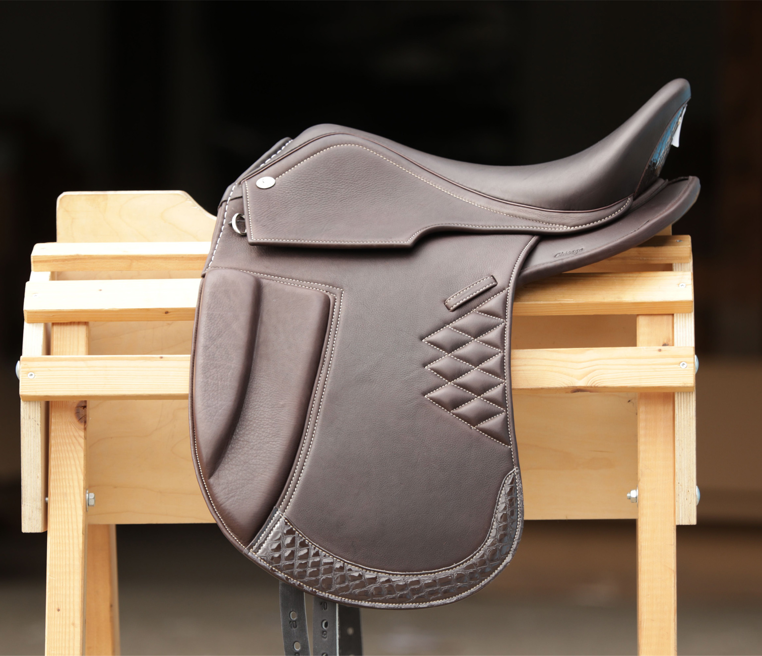 La silla Chicago está disponible en marrón oscuro y negro en varios tamaños de asiento. Los paneles de velcro de la silla se seleccionan individualmente según el dorso del caballo.