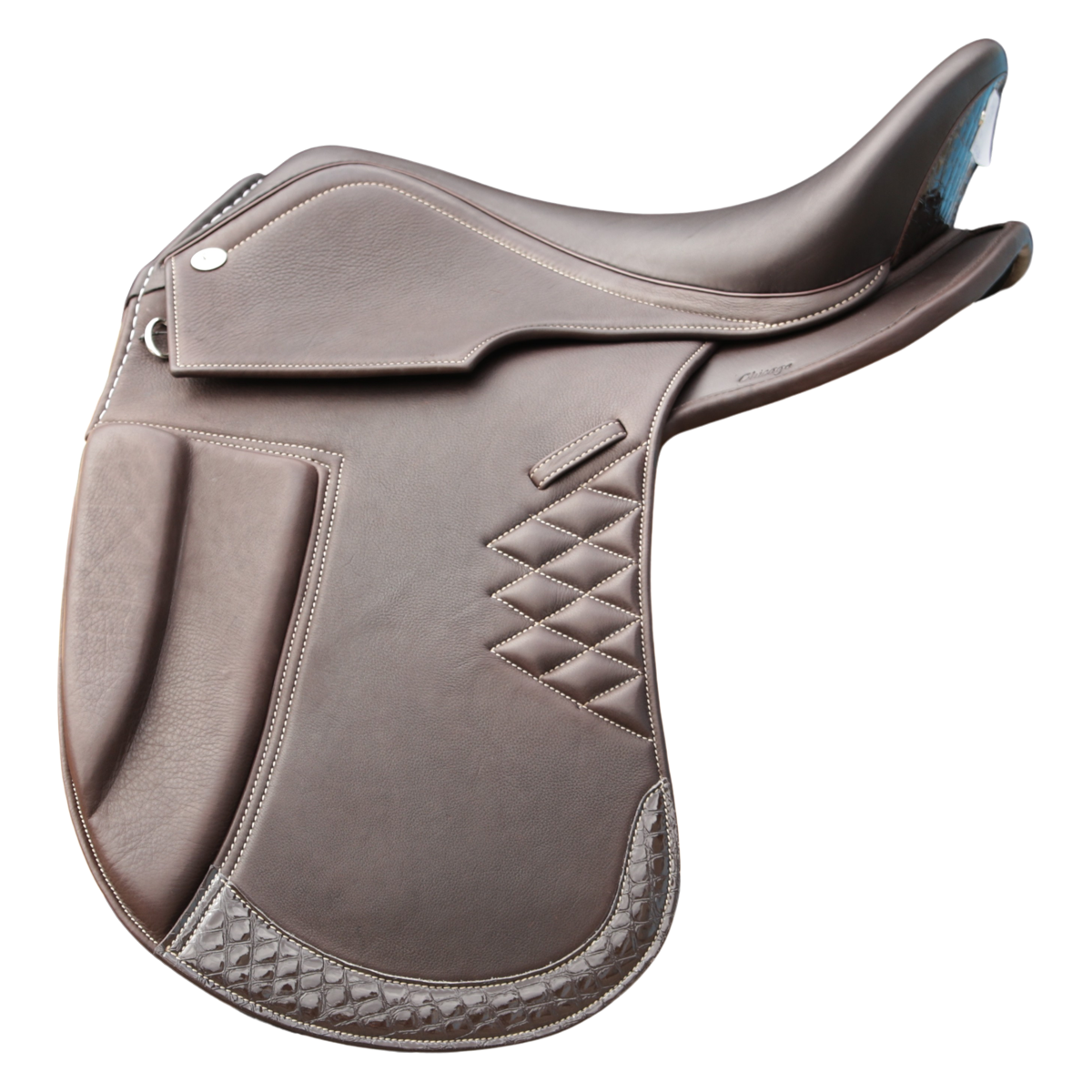 La silla Chicago está disponible en marrón oscuro y negro en varios tamaños de asiento. Los paneles de velcro de la silla se seleccionan individualmente según el dorso del caballo.