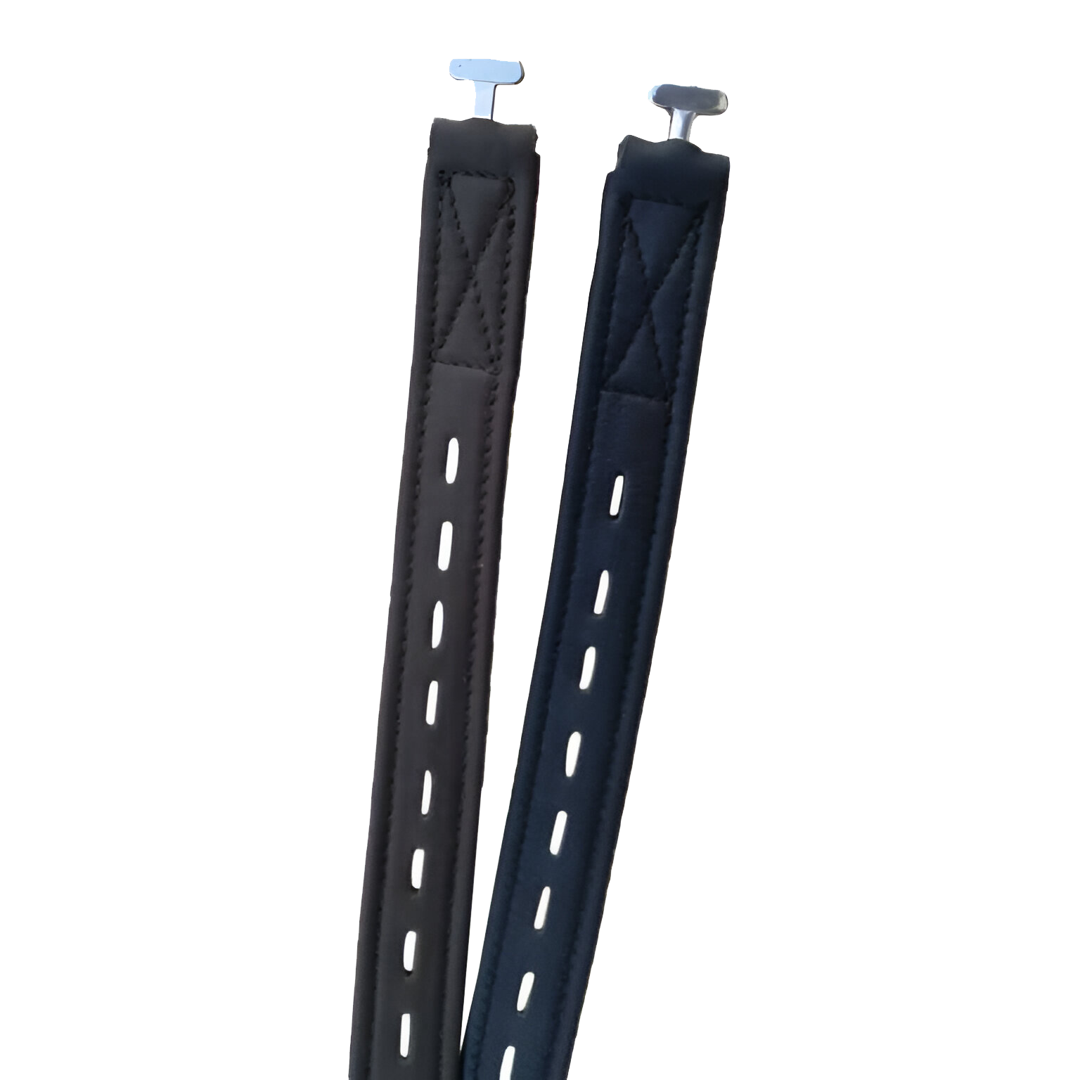 Estribos de cuero con presilla Conway. Con gancho de sujeción. La correa se mantiene fina en la pierna, lo que reduce la presión y garantiza un ajuste cómodo. El lazo de nailon está reforzado con cuero.